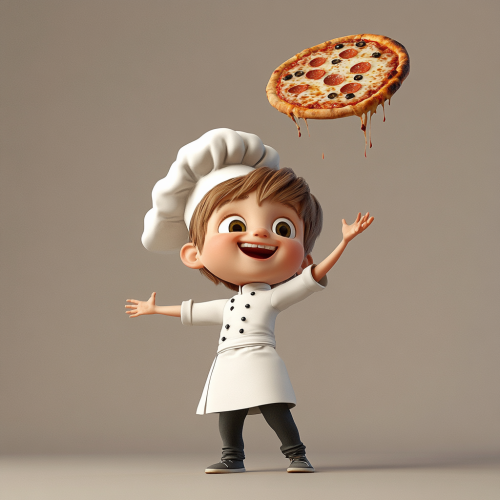 little boy, 5 years old, chef hat, tossing pizza, pixar style, animation, cartoon, 3d, plain background, having fun, cute, grey background, full body view