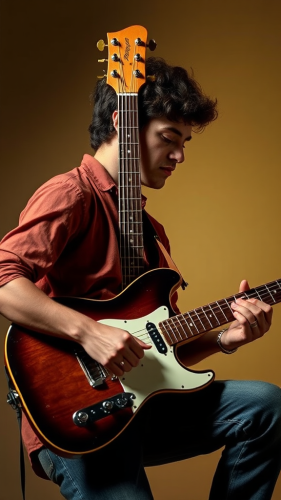 rock star eric clapton in heaven sitting on clouds crying playing guitar to a little boy looking sad