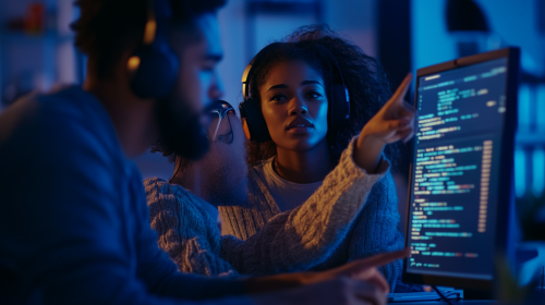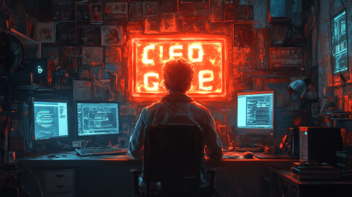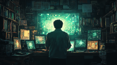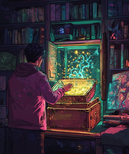 a man seen from behind, with his hands he is opening a treasure chest inside his room with his computers. The place has an aura of serenity and peace, digital art with vibrant colors, cartoon style. Magical glow coming from inside the chest. --ar 16:9 --s 750
