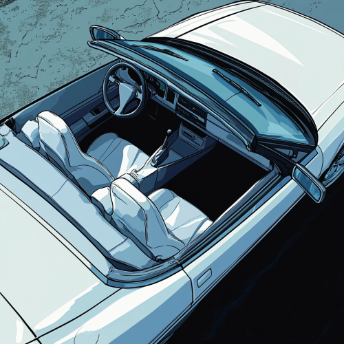 A comic-style illustration of a white honda, white color. The seat is open, and you can see inside of it, The image is shot from above. during midnight under clear sky
