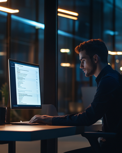 A stock market trader intensely focused on multiple computer screens, surrounded by charts, financial data, and flashing stock tickers, bathed in the bluish glow of monitors, capturing the high-pressure environment of modern finance, Photography, DSLR camera with a telephoto lens (100mm), shallow depth of field settings, --ar 16:9 --v 5.0