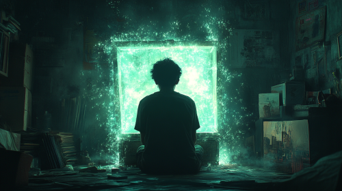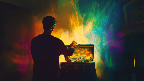 Camera viewing the silhouette of a man seen from behind, with his hands he is opening a treasure chest, digital art with vibrant colors. He is inside his room. Magical glow coming from inside the chest. --ar 16:9 --v 6.1