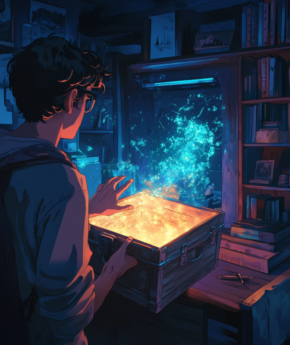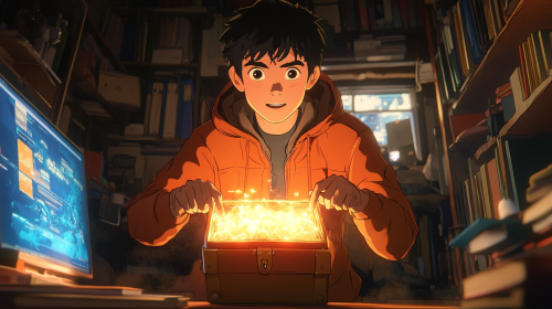 A camera showing a man facing the camera, opened a treasure chest with his hands. The scene takes place inside the man's room, which includes a computer and books, but the main focus is on the chest the man is opening.anime style, The place has an aura of serenity and peace, digital art with vibrant colors, cartoon style. Magical glow coming from inside the chest --ar 16:9 --s 250