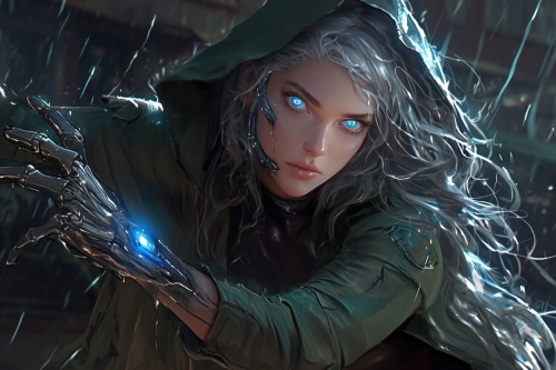 close up of a pretty older woman with long grey hair and blue eyes wearing a green coat kneeling and placing her hand on metal and wires during a thunderstorm in a dark town + horror + art style of Capullo, Brom, Whelan, aly fell rutkowski, art germ, rossdraws, and franzzeta + art station + ultra detailed + hyper realistic + 8k --ar 3:2 --niji 6