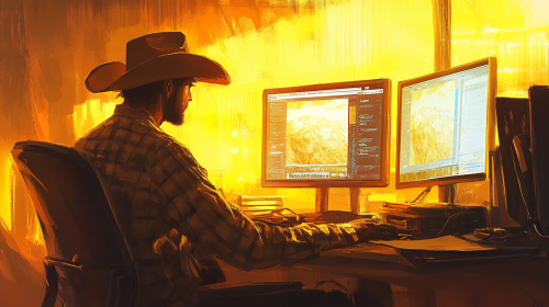 a tech person sitting at his desk looking at his two screens, sitting with a cowboy hat on / bright colors and room / daytime / whites yellows and real looking --v 6.1 --ar 16:9