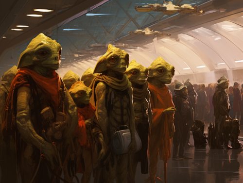 still shot from a sci fi movie, a crowd of many different realistic small intelligent polite pleasant odd alien creatures strolling through a high tech airport terminal on the planet Plindoria, digital illustration, warm yellow orange lighting, Frank Frazetta art --ar 16:12 --v 5.2