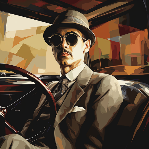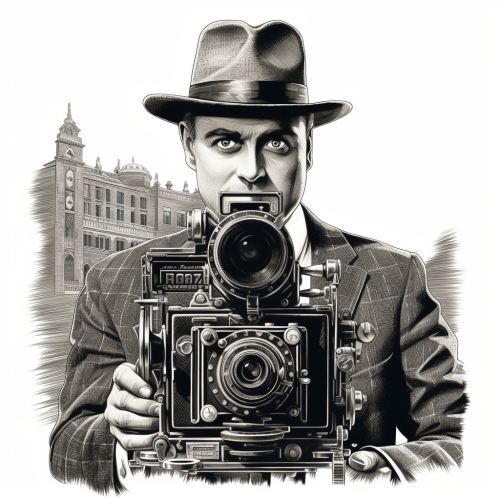 Hedcut illustration in the style of the Wall Street Journal. 1930s Kodak Movie Camera. There's a Man dressed from the 1930s operating the camera.