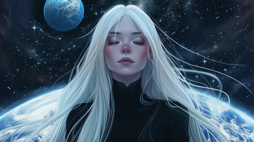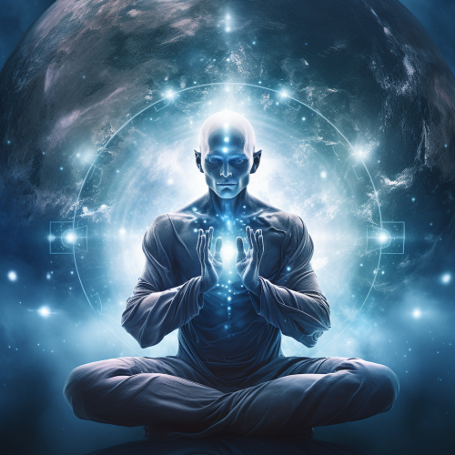 an HD picture of a humanoid being that has no hair, holding its fingertips up at its temples and meditating to the universe.