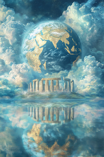 Surreal digital painting. The globe and Stonehenge are surrounded by blue clouds with gold trim. The atmosphere is dreamy. Below is the water surface reflecting the globe and clouds. The background is a space atmosphere. --ar 2:3