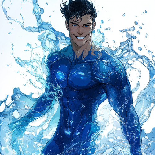 full body smiling male superhero made of blue water. white background. style of charlie bowater, laurie greasley and james jean, charlie bowater art style, beautiful comic art