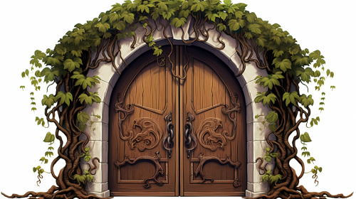 beautiful wooden doorways Closed door, vines, clip art, vampire bats, detailed, digital illustration, concept art, on white back round --ar 16:9