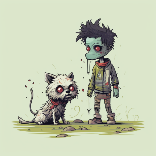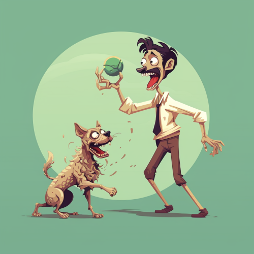 A decomposing zombie with ripped and dirty clothing, missing limbs, playing fetch with cute living dog, appealing, minimalist, stylized, cartoon, digital art