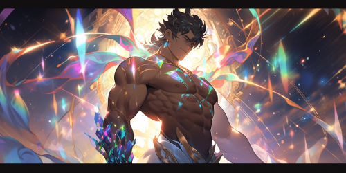 attractive male iridescent elemental character launching an attack, handsome face, smiling flirtatiously, masculine, muscular but slim, full body, chest, torso, six pack abs, vibrant, dynamic background, award winning creativity, aesthetic fantasy, extremely unusual design --niji 5 --ar 2:1