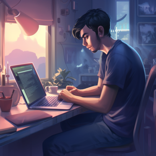gohan super saiyan 2 surrounded by a yellow energy. He is wearing a purple hoodie and ripped jeans. Use an anime style. Use dark colors with highlights of purple, yellow, and red.