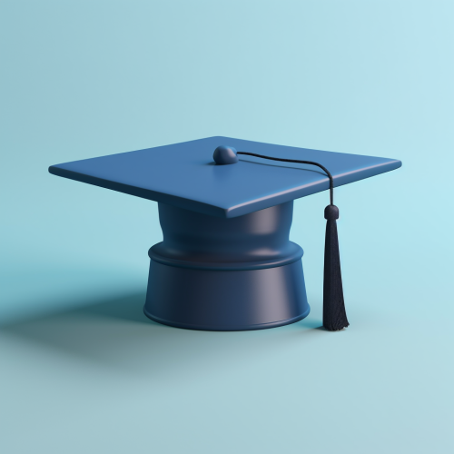 graduation hat, blue , 3d render, floating high above ground, round edge, smooth surface, short cilinder, blue background, frontal perspective, friendly
