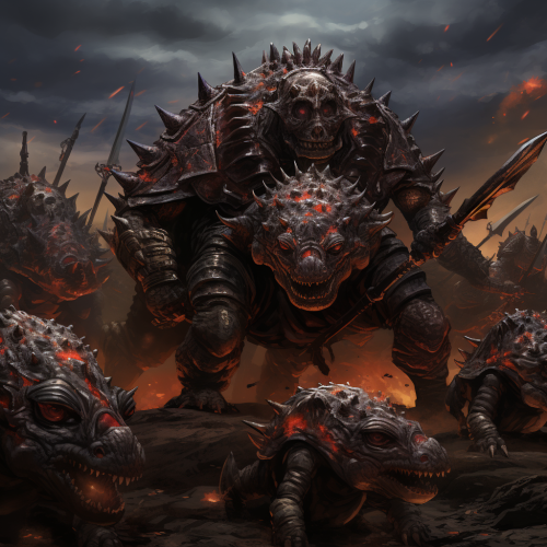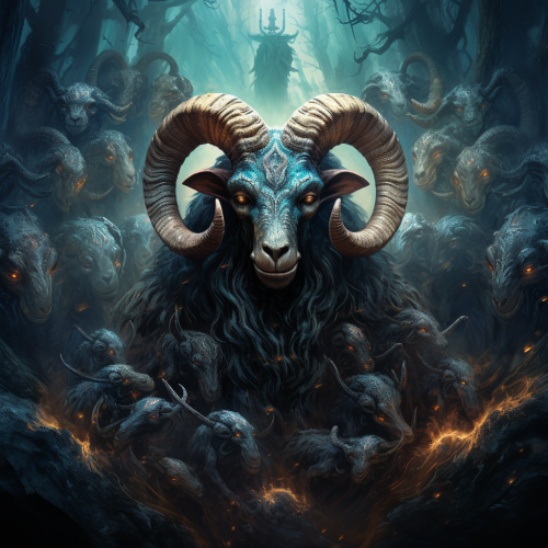 Grimdark mystic primordial flock of wild ram beasts, fantasy, digital art, masterpiece painting, ultra detailed, ultra high definition, 8K resolution, 3D shading, superior quality, cover illustration, complex design, luminous highlights, rich vibrant colours, hyperrealistic, meticulously hyper detailed, artstation