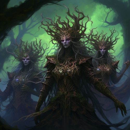 Grimdark mystic primordial herd of enthralling Sylvaneth dryads, fantasy, digital art, masterpiece painting, ultra detailed, ultra high definition, 8K resolution, 3D shading, superior quality, cover illustration, complex design, luminous highlights, deep rich vibrant colours, hyperrealistic, meticulously hyper detailed, artstation