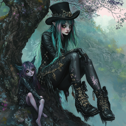 A whimsical, gothic, and kawaii style art scene featuring a Spooky eerie zhangjiajieism with messy long hair sitting on an extinct tree with her ghoul beside her. She wears a top hat, styled by Artgerm, leather pants, buckled boots. The color palette includes turquois, pinks, blacks, green, gold and lavenders, with touches of white. The setting is magical and enchanting, like a moonlit forest or mystical castle, reminiscent of Tom Bagshaw, Stefan Koidl and Nam Das's work.