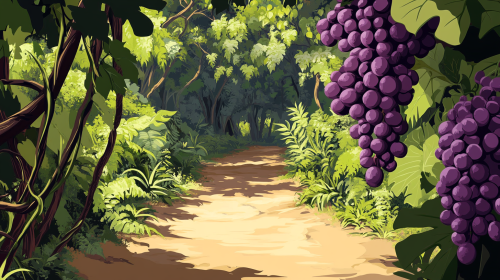 a highly stylish Disney cartoon style mysterious fairy tale children's story backdrop, a shady tropical trail in middle of the jungle, with grapevine in the foreground --ar 16:9