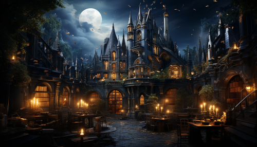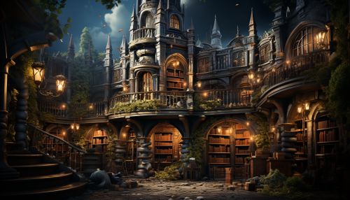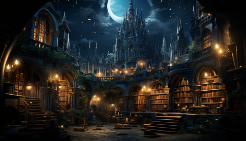 The old library with lots of books from the haunted castle of Beauty and the Beast, it's the night - HD and realistic style in a magical setting --ar 7:4 --s 750 --v 5.2