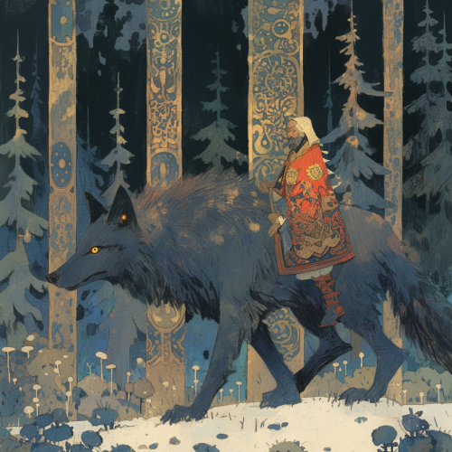 Create a dark, magical illustration in the style of Russian fairy tales by artist Ivan Bilibin. A big gray ferocious wolf, with big glowing yellow eyes, a Slavic boy rides on it. The wolf in a three-quarter pose walks through an old dark forest of interlocking spruce and thin birch trees. Lots of detail, mushrooms, moss, crows, clouds obscuring the moon. --s 750 --niji 6