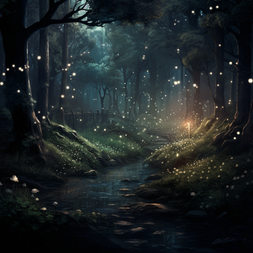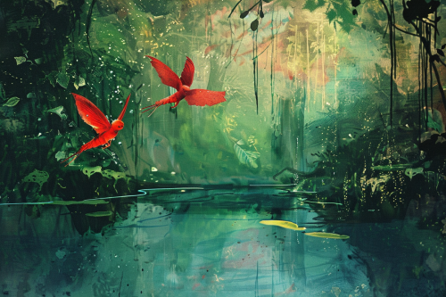 childrens book illustration, bright colors, collage, of Two red fairies flying through the forest land on a leaf that floats in a stream --ar 3:2 --v 6.0