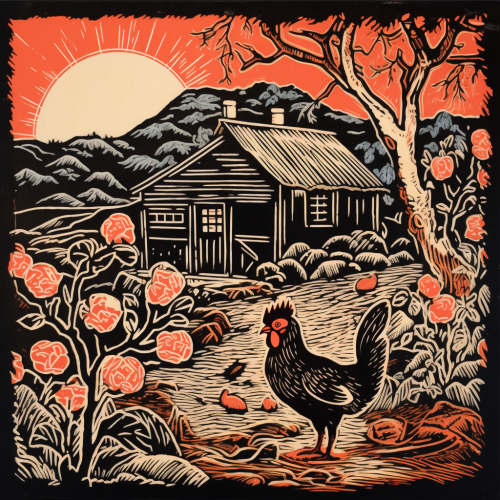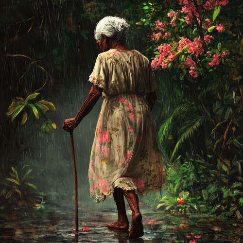 an old haitian magical woman, bent using a walking stick, walking in the rain, with trees blooming out of her back, wise, barefoot in a long tattered dress. magical realism style