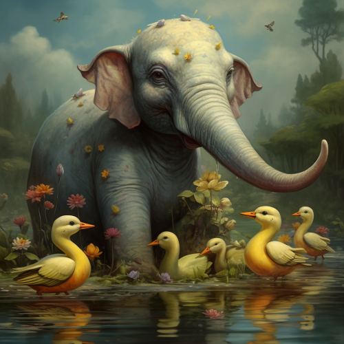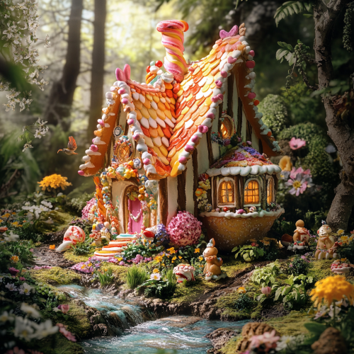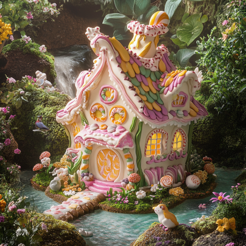 A whimsical pastry house nestled in a lush, enchanting natural setting. The house is designed to look like a giant, colorful cake with icing and candy decorations on the exterior. It’s surrounded by blooming flowers, vibrant greenery, and a serene, flowing stream. The roof is adorned with whimsical details such as gingerbread shingles and candy cane pillars. The scene includes playful woodland creatures, like birds and squirrels, interacting with the house, adding to the magical and delightful atmosphere of this nature-infused pastry haven. 4K, HDR, highly detailed