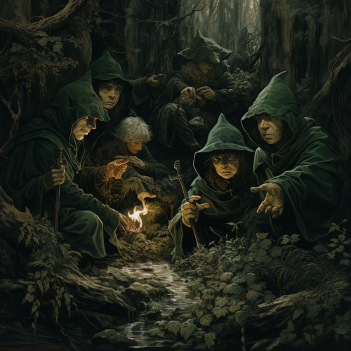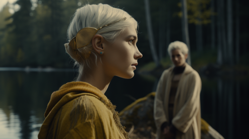 movie scene inside a forest next to a lake two realistic elfs with big heads and pointed ears next to a woman with gold hair , movie scene, oscar winning scenography, 50mm,4k, side shot --v 5.0 --ar 16:9