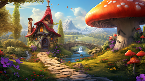 beautiful storybook mushroon cottage in open meadow of green grass, lamp post, huge tree trunks and tall trees, red flowers, purple flowers, yellow roses, cobblestone, foot bridge over rocky stream, bright sky, red, blue, purple, yellow, green, cyan, steampunk atmosphere of stunning concepts and elements, mountains in distance, heavenly --ar 16:9