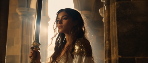 movie scene a brunette princess holding a knife, looking up and going upstairs inside a tower, side view, knife in a hand, oscar winning scenography, 50mm,4k,ultradetailed --v 5.1 --ar 21:9