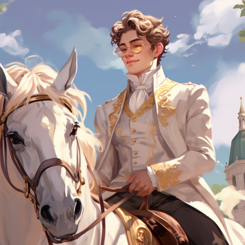 Prince Charming on a horse handsome young prince painterly anime style, round glasses outfit with gold accents, shy, cute, romantic
