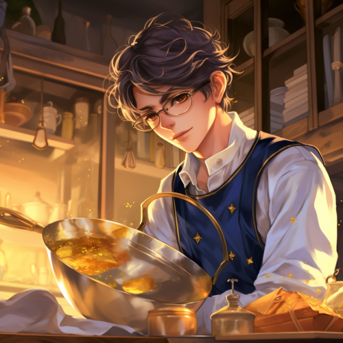 Prince Charming cooking young prince painterly anime style, round glasses outfit with gold accents, shy, cute, romantic
