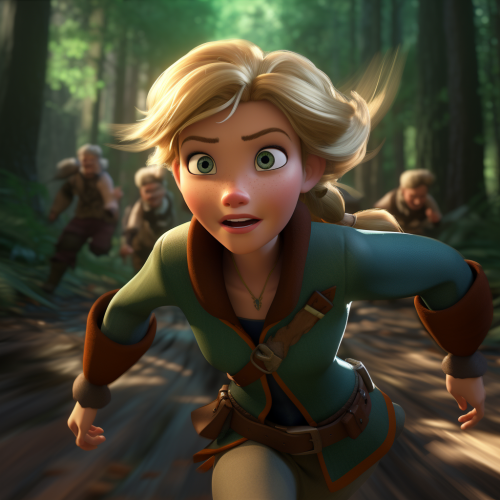 cinderella, running through dark forest, short blonde hair, bangs, brown leather armor, green clothes, angry, style: disney animated style 3d animation