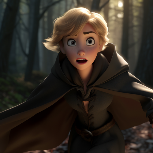 cinderella, running through dark forest, short blonde hair, bangs, leather armor, gray cloak, angry, style: disney animated style 3d animation