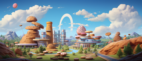 a landscape of a Cookie Worlds Fair, with a theme park and giant Bakery, factory next to it, brutalist architecture, woodland forest, structures made of cookie, flinstones, in the style of pixar, digital art --ar 21:9
