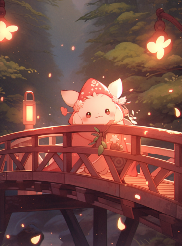 super cute (elven creature) on a quaint elven wooden bridge in a forest surrounded by mountains, sanrio aesthetics, red and green tones, warm fairy lights, kawaii, anime style --niji --ar 11:15