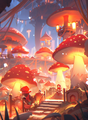 super cute (elven creature) elven wood pavillion surrounded by glowing giant red mushrooms surrounded by mountains, sanrio aesthetics, red and green tones, warm fairy lights, kawaii, anime style --niji --ar 11:15