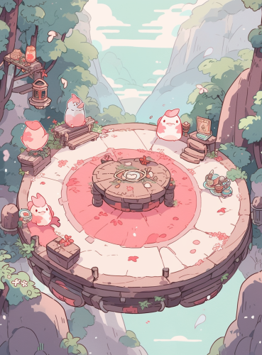 super cute (elven creature) wooden circular pavement surrounded by mountains, sanrio aesthetics, red and green tones, warm fairy lights, kawaii, anime style --niji --ar 11:15