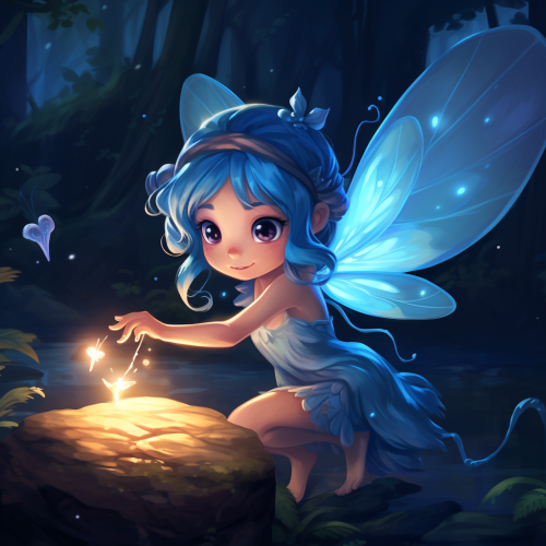It's a cute 2d cartoon illustration for the game. A beautiful little fairy fly with blue hair and a blue dress has glowing wings and is trying to catch a beautiful glowing butterfly