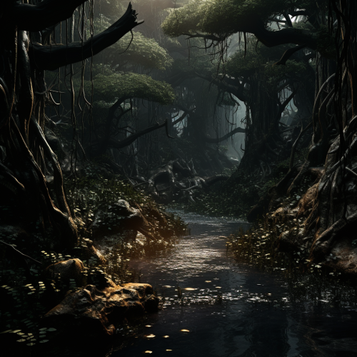 a highly stylish disney cartoon style fairy tale children's story mysterious backdrop, a shady tropical trail in middle of the jungle, with grapevine in the foreground --ar 16:9