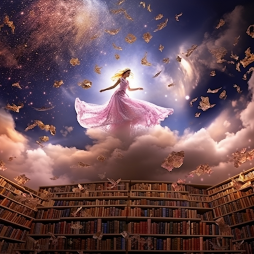 fairy high clouds space library with dancing people indian flag inside /style luxury gold ultraviolet pink silver glitter colours / photorealistic hyperrealistic 9:16
