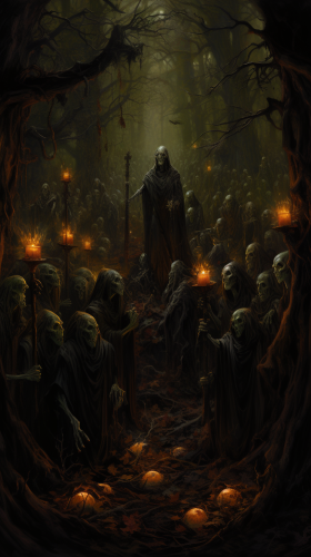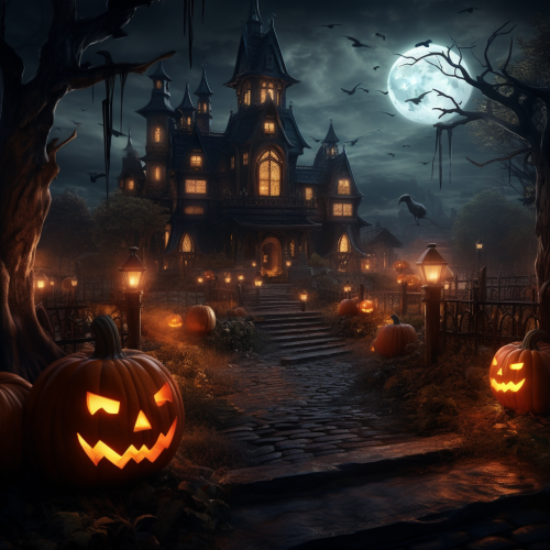 Haunted gardens of a dark, gothic castle at night, with twisted, eerie plants and overgrown pathways. The moon casts an ominous glow over the scene, with shadows stretching across the ground. Dead trees with gnarled branches reach up like claws, and thorny vines wrap around broken statues and fountains. Creepy, glowing jack-o'-lanterns are scattered throughout the garden, adding a sinister Halloween vibe. Fog rolls across the ground, and strange, ghostly lights flicker among the trees. The entire scene feels spooky, mysterious, and filled with dark magic, perfect for a haunted fairy tale. - HD and realistic style in a magical setting --ar 7:4 --s 750 --v 5.2