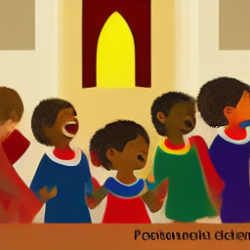 happy diverse children celebrating, protestant church setting, ar 3:2 --v 3