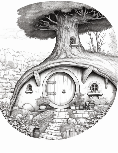 a black and white art drawing sketch, of a charming hobbit home in a smooth hill with a circular door and moss-covered roof, view from the side, in the style of lilia alvarado, lush trees and beautiful plants in the backdrop, imaginative characters, fairy tale illustrations, trompe-l'œil illusionistic detail, whimsical cartoon, cottagepunk, minimal shading --ar 100:129