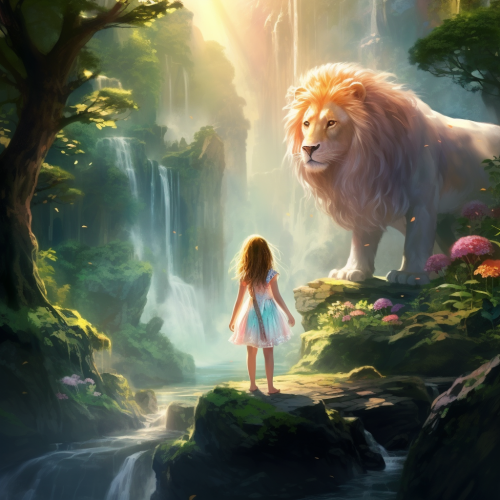 A little girl wear dress white and Lion in mountains magical forest with view water fall lake shining, flowers, fantasy painting