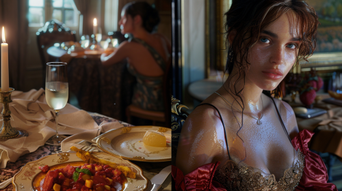 A split screen. On one side, Mason and Lilith enjoying a fancy dinner. On the other side, Zoe alone at home, looking distressed. hyper realistic, 32k --ar 16:9 --v 6.0 --s 250