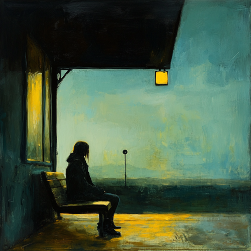 A poignant and emotive scene capturing the feeling of waiting with anticipation and hope. The setting could be a quiet, intimate location such as a solitary figure sitting on a bench at a scenic overlook, waiting by a softly lit window, or a peaceful spot at a train station or bus stop. The central focus is on the figure's expression of longing or hope, perhaps looking into the distance or gazing at a clock or empty chair. The background features gentle, calming colors like soft blues, warm golds, and muted greens to enhance the mood of waiting and anticipation. Subtle details like a faint, hopeful light on the horizon, a gently falling rain, or a clock ticking can add to the sense of waiting. The overall mood is tender and reflective, capturing the essence of patiently awaiting someone's arrival or presence.