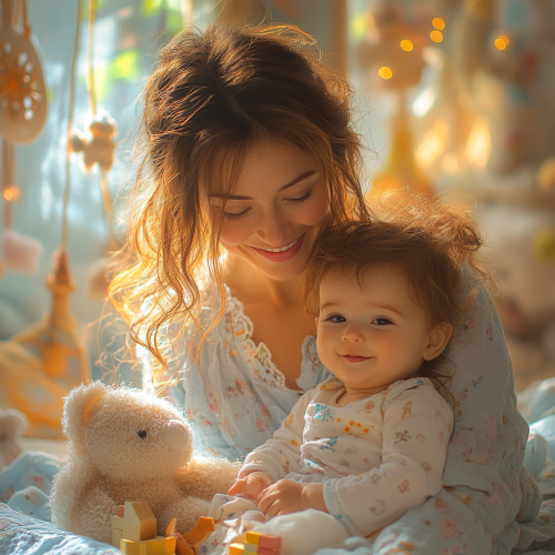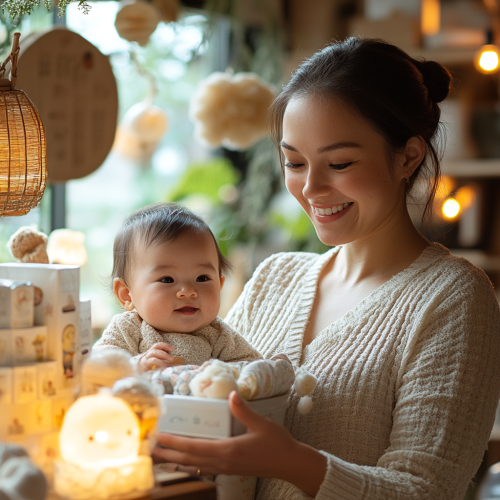 Create a ultrarealistic photograph of a professional, caring woman assisting a mother with her baby. The woman's hands are naturally positioned, offering a product or advice with attention to detail. The scene is warm and inviting, set in a cozy environment with high-quality baby toys on display. The lighting is soft, highlighting the warmth and professionalism. Every detail, including facial expressions and hands, is meticulously crafted to convey trust, care, and commitment to customer satisfaction. --s 750