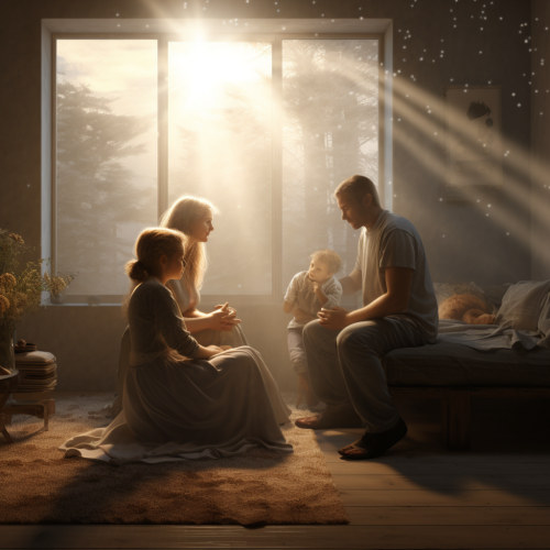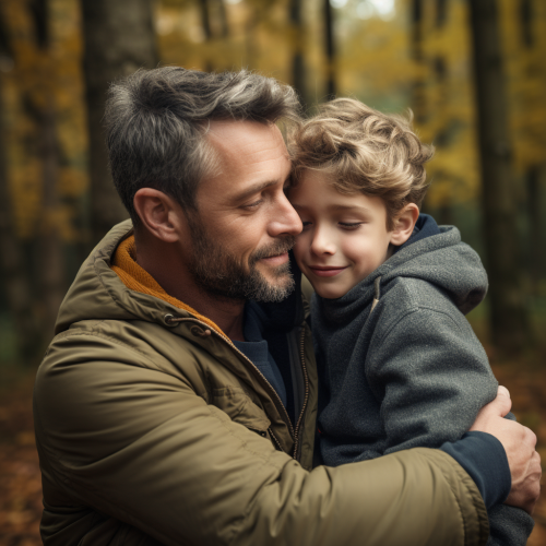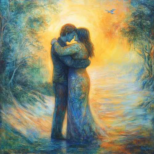 A serene and uplifting scene that captures the essence of forgiveness and reconciliation. The setting could be a peaceful, harmonious environment such as a sunlit clearing in a forest, a calm, tranquil beach, or a warmly lit, cozy room where two figures are embracing or sharing a meaningful moment. The central focus is on a gesture of forgiveness, such as a heartfelt hug, a reassuring hand on a shoulder, or a symbolic gesture like the release of doves or a blooming flower. The background features soft, soothing colors like gentle blues, warm oranges, and soft greens to enhance the sense of peace and emotional healing. Subtle details like soft light beams, gentle waves, or peaceful patterns add to the atmosphere of forgiveness and calm. The overall mood is warm and reassuring, capturing the feeling of letting go and moving forward with understanding and compassion.